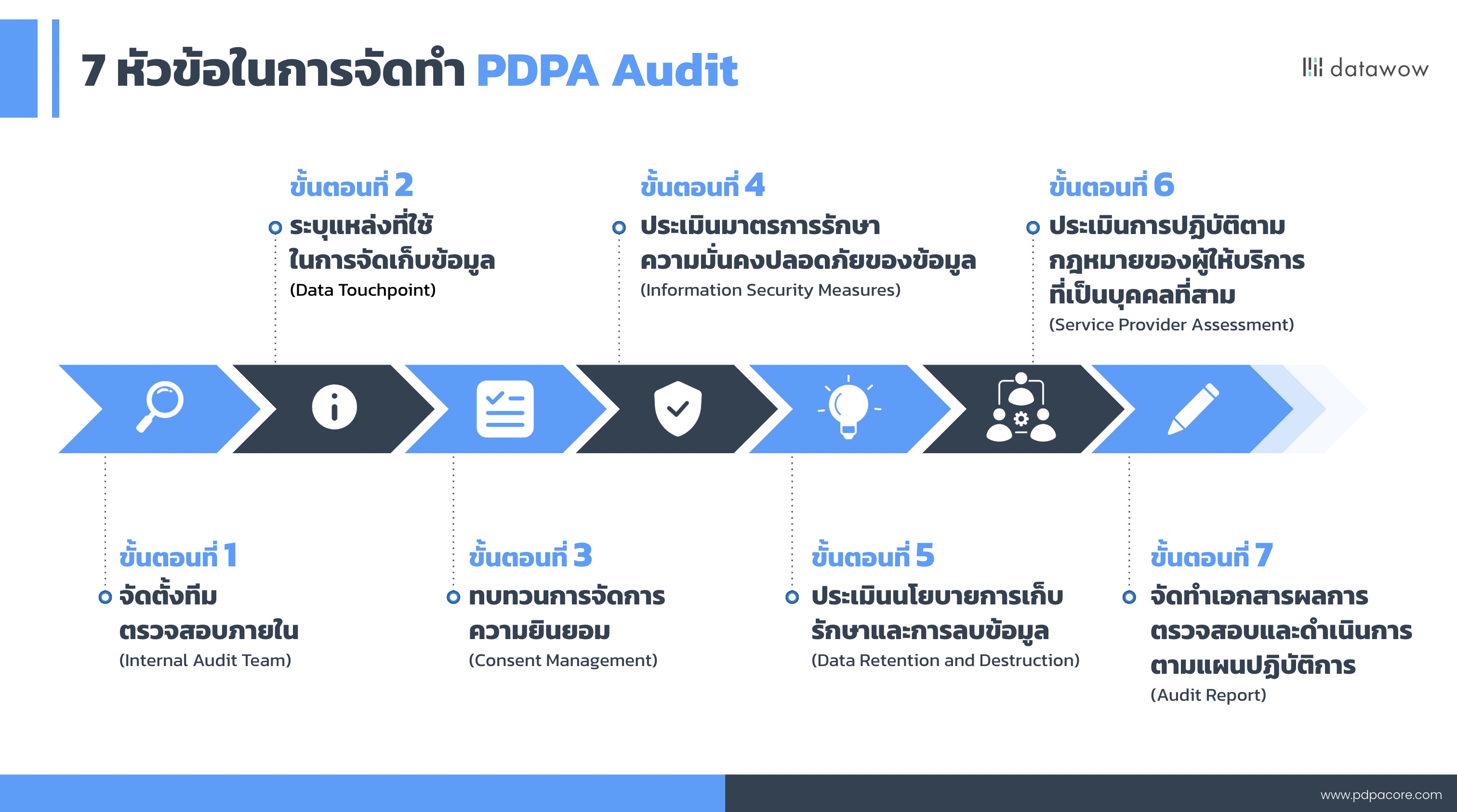 การตรวจสอบการปฏิบัติตามกฎหมาย PDPA (PDPA Audit) เป็นกระบวนการภายในที่องค์กรจะประเมินนโยบาย กระบวนการ และแนวปฏิบัติด้านการคุ้มครองข้อมูลเพื่อให้แน่ใจว่าเป็นไปตามข้อกำหนดของกฎหมาย PDPA